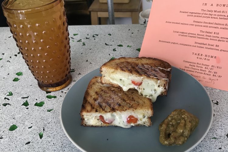 Companion’s unique selection of hot and cold beverages includes house-roasted coffee (Kai personally does the roasting), select teas, and fresh juices. And a rotating cast of vegetable-forward food options are divided into two categories–On Toast or In a Bowl. The toasts are the perfect vehicle for options like house-made nut butter, the ubiquitous avocado, herb roasted mushrooms with gooey raclette cheese, or the recently added Gobi Chana (roasted cauliflower and chickpea puree seasoned with warm, aromatic spices).  Bowls provide a more substantial option with the likes of smoked salmon and quinoa, or homemade yogurt, fruit, and nut butter, but the star is the Daily Mush–a portion of quinoa topped with gobi chana mash, purple kraut, herbed tomatoes and the daily fresh-roasted vegetables–on my recent visit, sweet potatoes, cauliflower and brussels sprout. Tip: add avocado for a creamy contrast to all the crunchy yum!